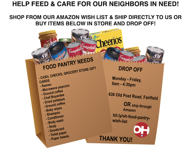 Regular sized items (not bulk or travel) appreciated. Drop off at our pantry M-Fr, 9am-4:30pm at 636 Old Post Road; there’s a drop off area to the left of the building. Please ring the bell and someone will greet you. Please do not leave donations unattended and/or when the office is closed. Monetary donations are always welcome so we can purchase exactly what we need for our clients, donate here. Or, feel free to purchase from our Amazon wish list here and your donation will be shipped directly to the pantry. Thank you!